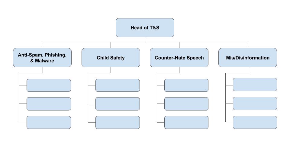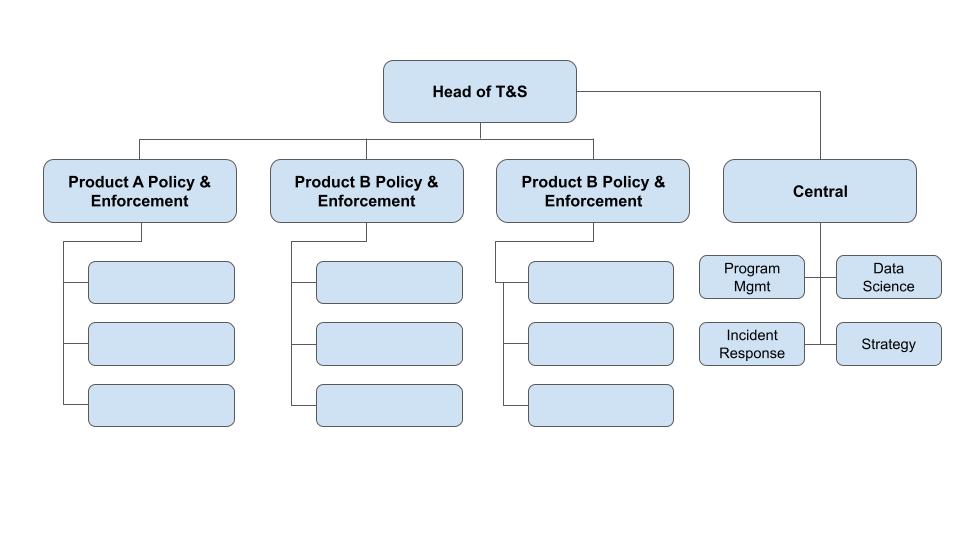 In a function-based structure, sub-teams are formed based on each core job role within trust and safety. There is a product management sub-team, an engineering sub-team, an operations sub-team, a policy sub-team, an incident management sub-team, and so on.