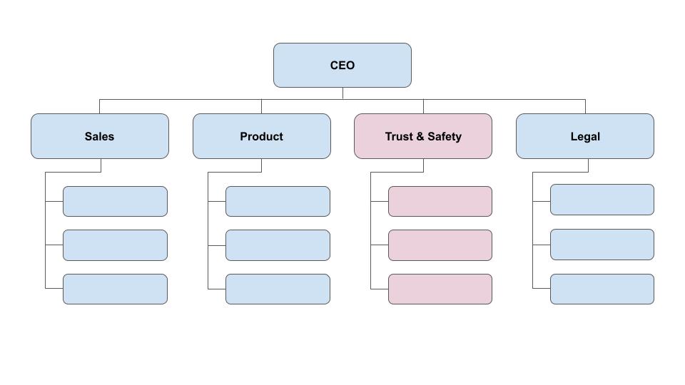 No matter the approach, selecting where trust and safety fits within the broader company’s organizational structure can have important implications for how trust and safety is perceived and the level of influence a trust and safety team has within an organization. Additionally, to whom trust and safety reports internally can also directly or indirectly affect its ability to have a voice independent of competing incentives, such as revenue, public policy, or public relations considerations. In a centralized model, the leader of trust and safety most often reports to either the Chief Executive Officer (CEO), the Chief Operations Officer (COO), or the Chief Legal Officer/General Counsel (CLO). Reporting directly to the CEO conventionally signals the team’s importance and that trust and safety is a major priority for the company. A trust and safety leader who reports to the COO can indicate that trust and safety is tightly aligned with the company’s business needs and objectives, but may also suggest that if trust and safety needs conflict with revenue generating interests, trust and safety needs may be deprioritized. Reporting up to the CLO can mean the trust and safety team is more compliance-focused and may not directly influence new and emerging products and services.